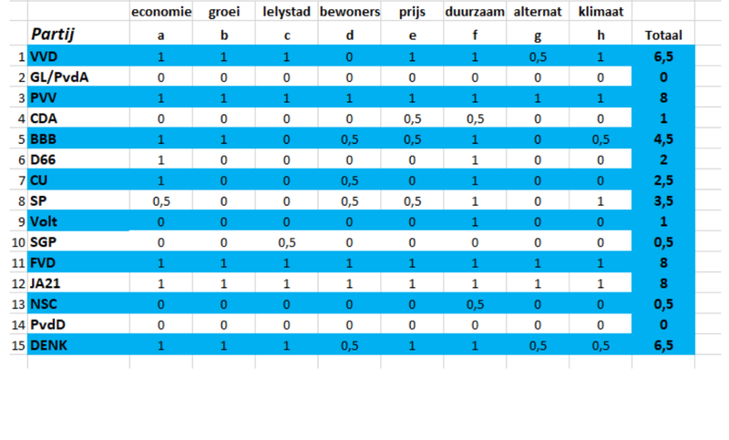 Aan de uitspraken van partijen over de acht rubrieken is een cijfer gegeven. Een hoger cijfer betekent een standpunt dat meer wijst op pro vliegen.